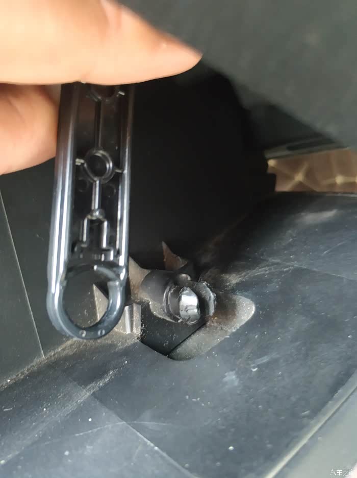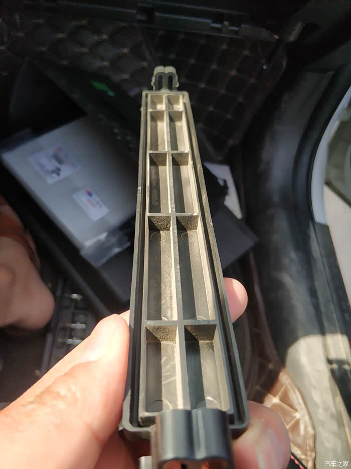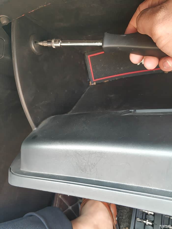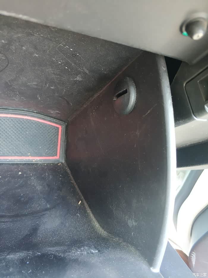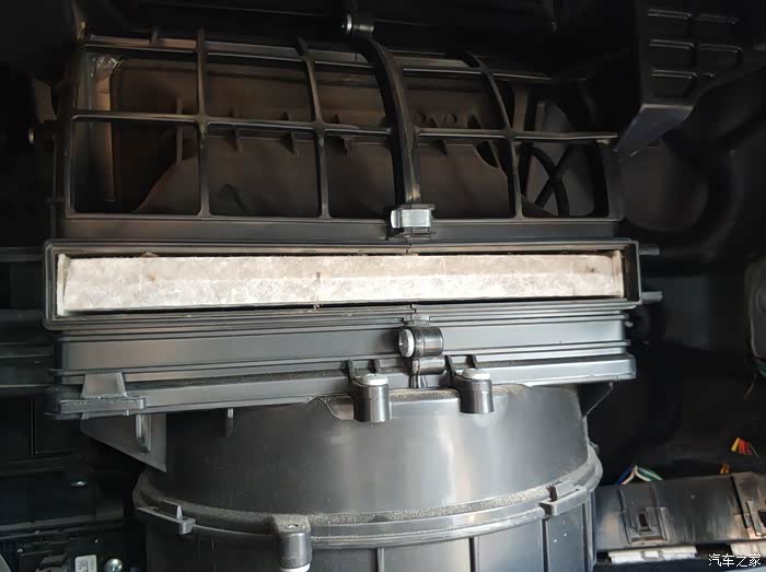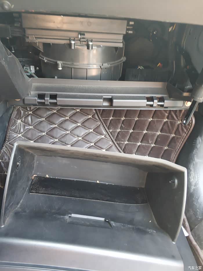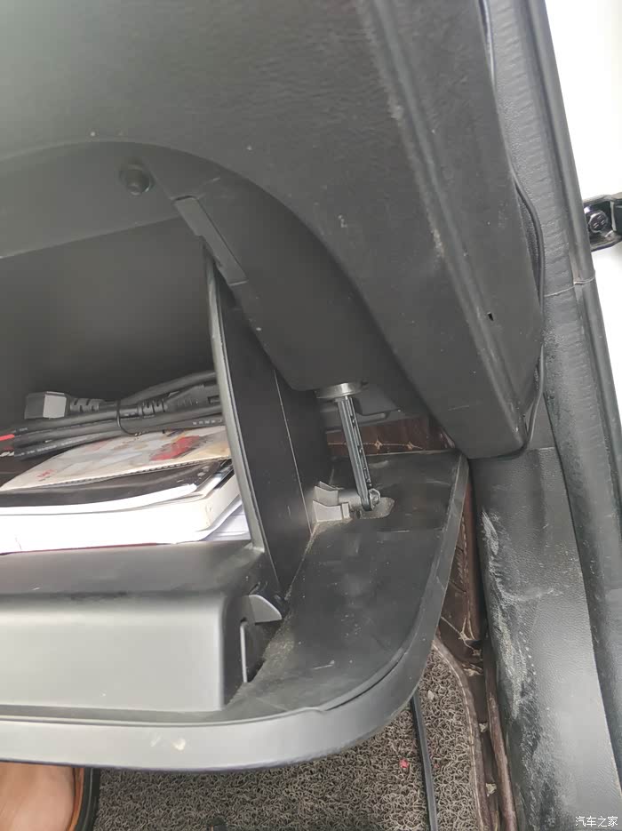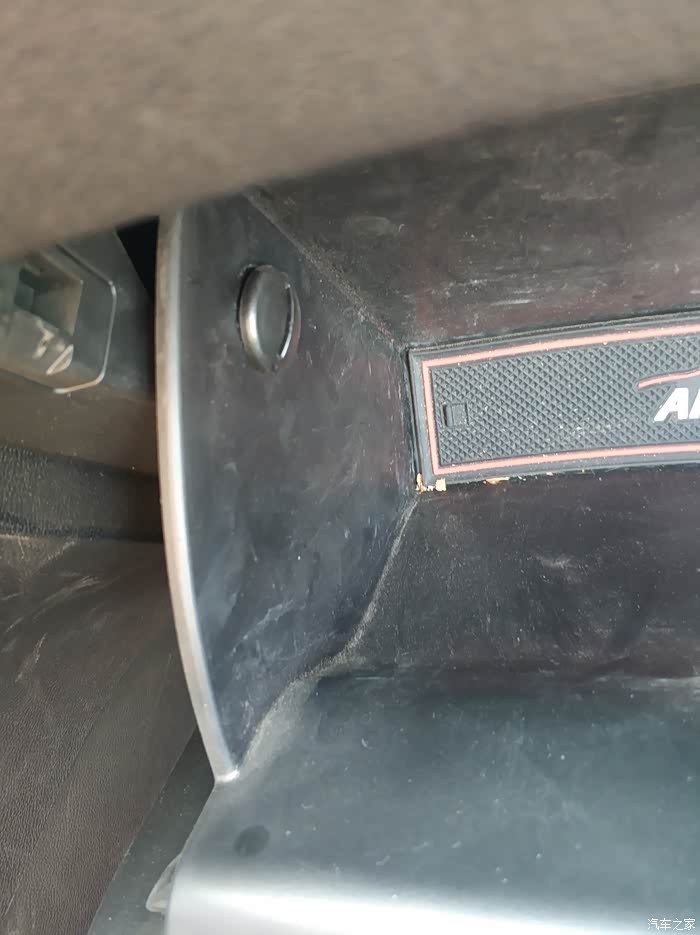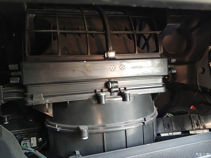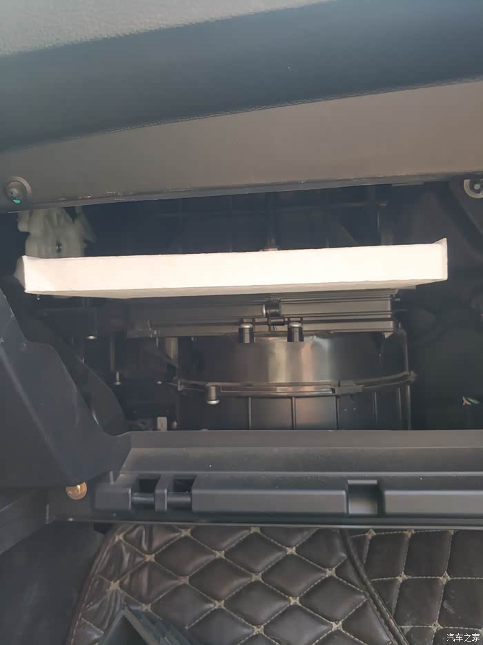 去掉副驾储物箱之后漏出来的这个带有PPT字样的就是滤芯盖子,捏着两边的扣子向外扒就出来了。
