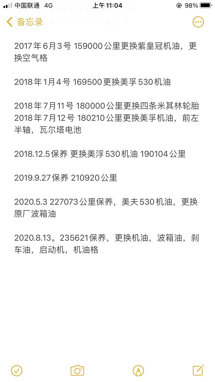 基本都是美孚530机油,京东旗舰店,平均一万左右换一次。以前偶尔用过紫皇冠,后来朋友没做了就还是用回美孚。