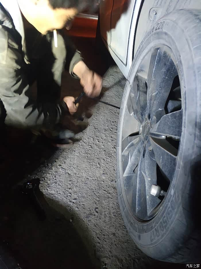 搞之前最好是先找几块石头把其他几个轮胎找个石块什么挡一下防止更换轮胎的时候汽车滑动。