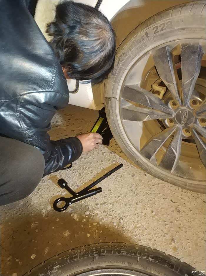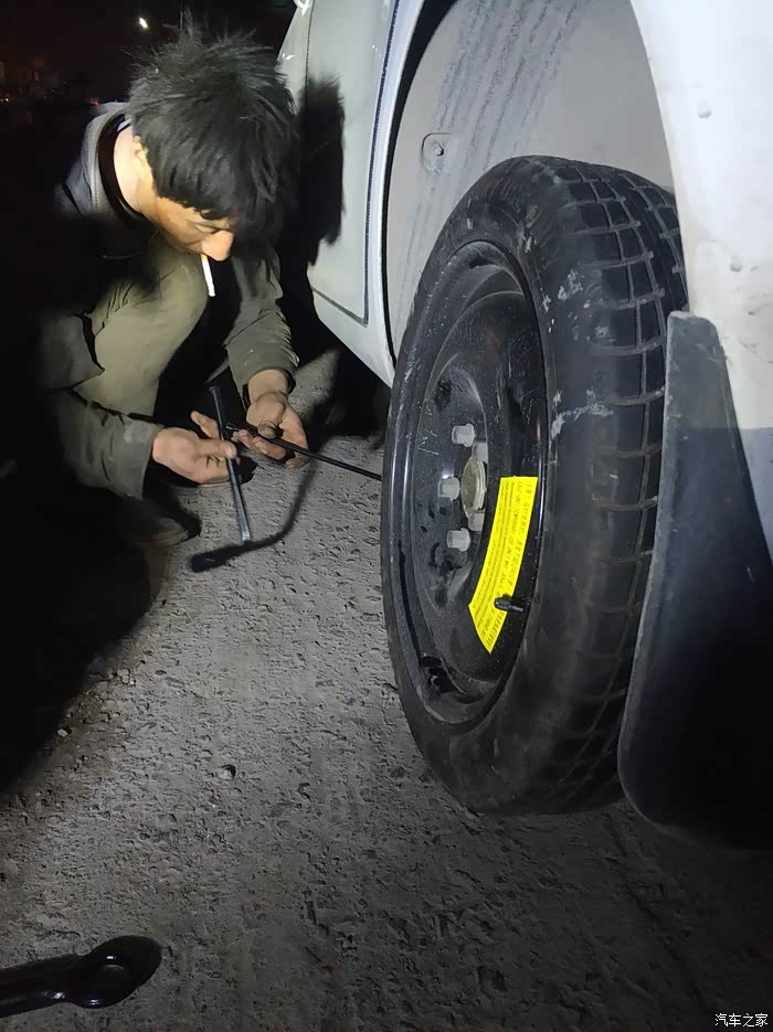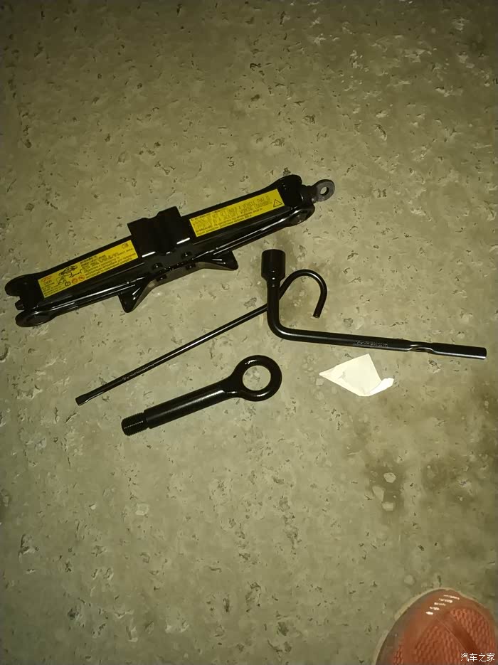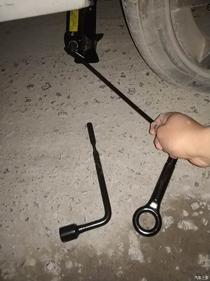 尴尬的小插曲从这里开始,本来打算自己更换结果千斤顶一拿出来不知道怎么用,离家不远就给砍老丈人喊来了他原来修车的摇了半天摇不起来就去找了个熟人来也是捯饬了半天,马上快要摇起来的时候才知道自带的扳手上边有眼儿,套在带钩的那根杆儿上当摇把就轻松的摇起来。