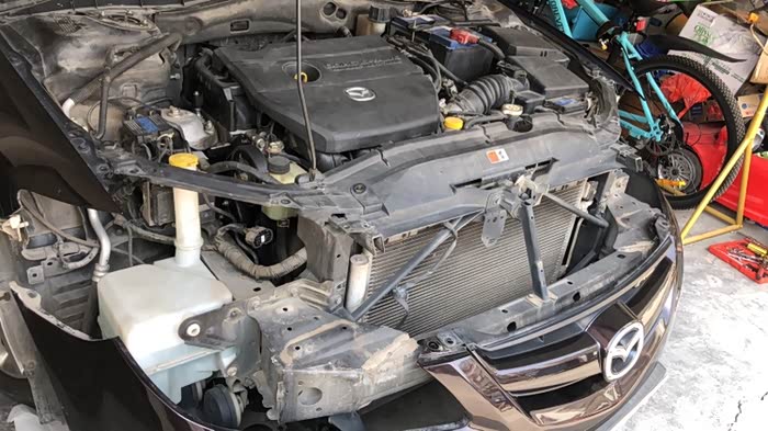 反正也就一边三个卡扣,保险杠与前叶子板处有一个螺丝,8号套筒,保险杠下面一边都是5个螺丝,也是8号套筒,中网和前杠上边4颗螺丝