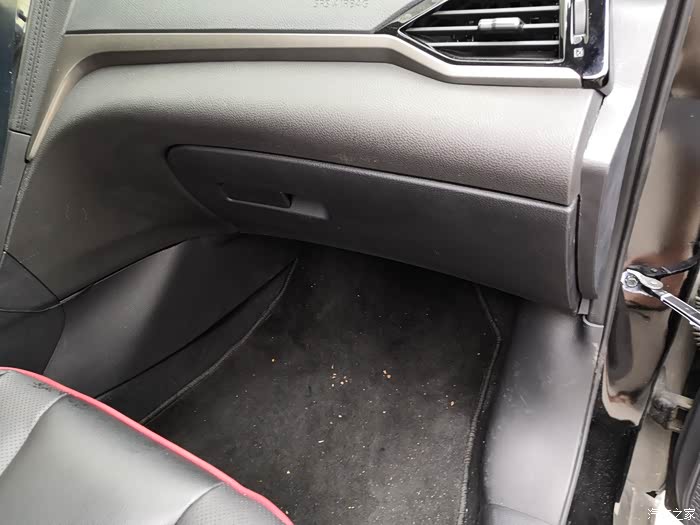 首先需要确认,空滤就在副驾驶手套箱底下的左边,大家可以开着闪光灯,先把位置确认好