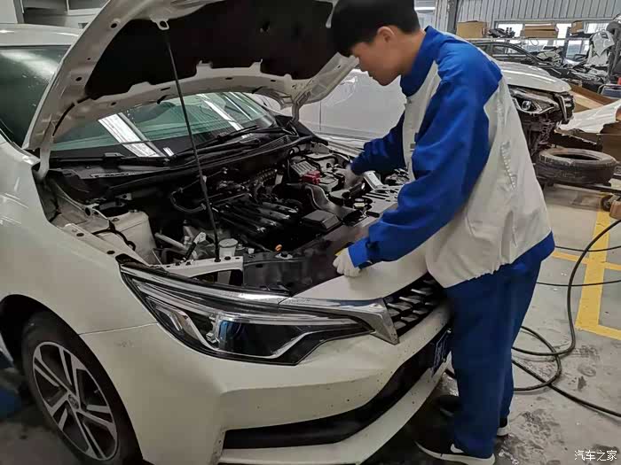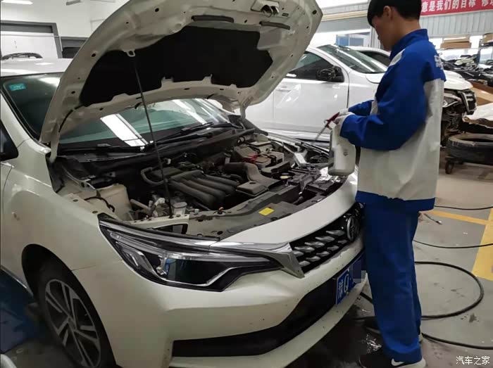发动机舱太脏了,满满的灰尘,师傅用水枪开始冲洗了,这个位置竟是犄角旮旯,没有这工具,还真是不好清理呢