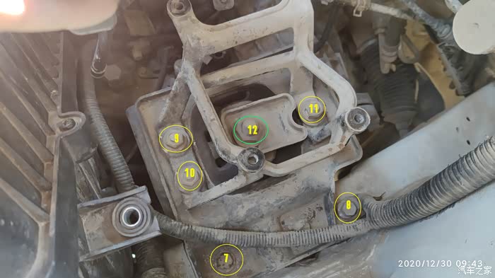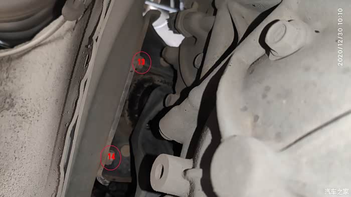 13和14是13mm螺栓,使用直柄带平面棘轮的扳手比较省力,这也是拆左机脚的第一步;安装左机脚也是这两个螺栓第一步,14螺栓的安装废了我半个多小时