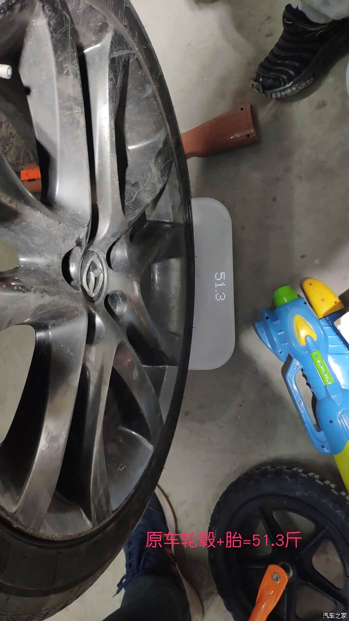 再回头看看,原车轮毂+韩泰=51.3斤。新装备单一个轮子足足轻了9.6斤,四个轮子合计38.4斤,这可全是簧下质量啊!