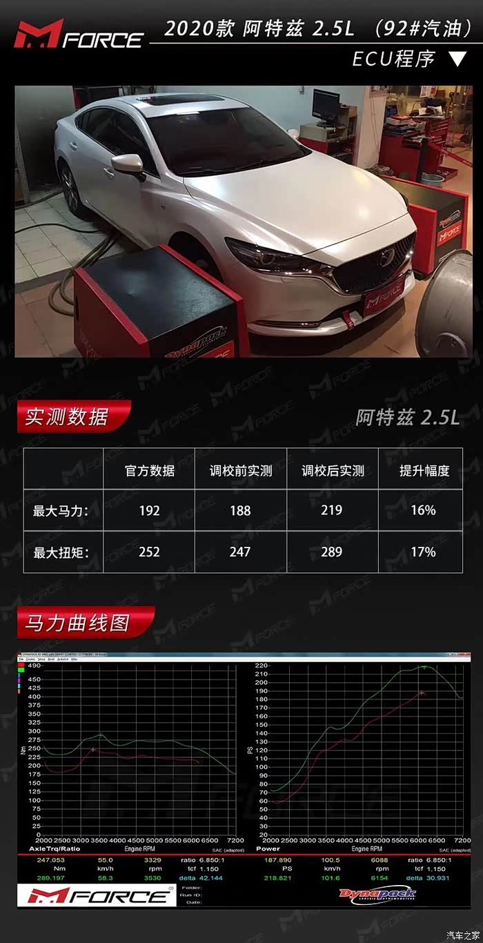 刷完ECU 上马力机测试结果。马力提升219匹,扭矩289