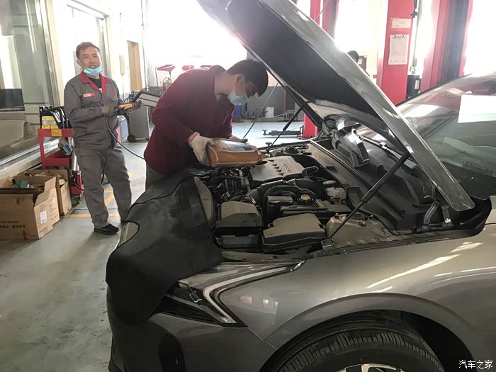 接下来就是换上新鲜的“血液”了,另一个师傅告诉我,滤芯还可以用用,所以用气枪吹了吹,让我少花点费用,人还是不错的。