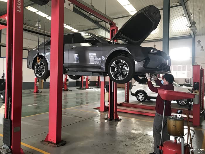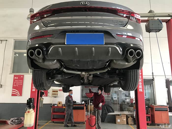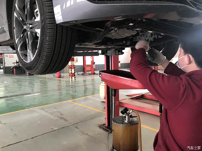 师傅让我躲远一点 不然那弄一身油。正好整个车辆升起来的时候,师傅也给我检查了胎压情况,以及底盘零部件情况。师傅检查的比较细致,底盘螺丝都给我看了一遍,还拿小电筒仔细查看了。