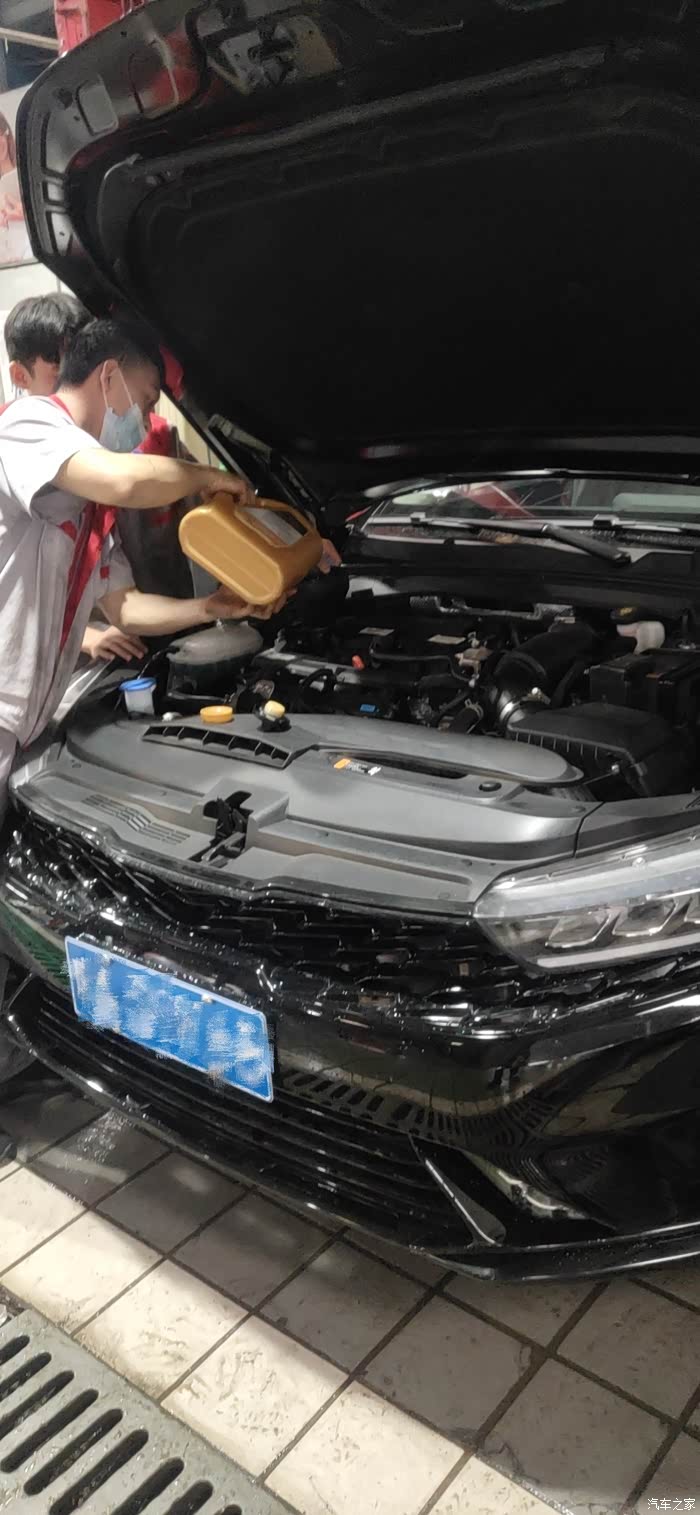 正在换机油的技术小哥和他的副手,一瓶机油没有用完,还剩了一点机油。