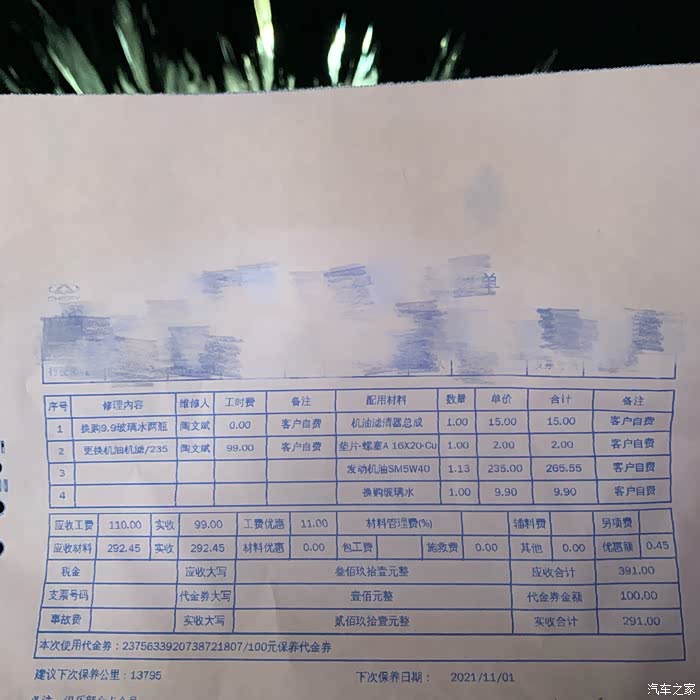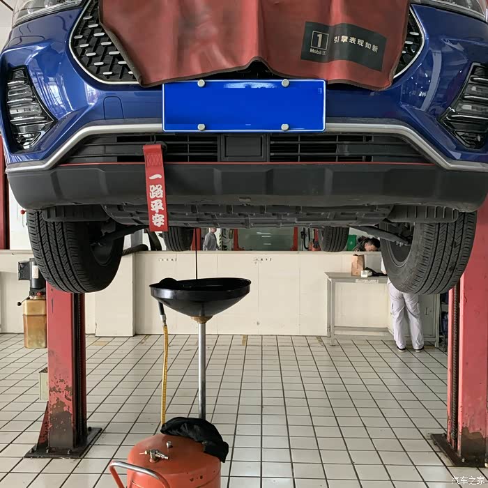 服务单给到师傅的时候,我的车已经在放车里的机油啦。黑乎乎的,难怪最近发动机高转速声音有点大,而且这个机油也是首保送的最便宜的。由于师傅提前释放了机油,所以单子一来他立马就开始了保养工作,这里节省了很多时间。