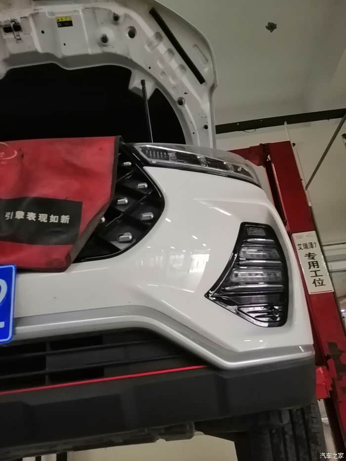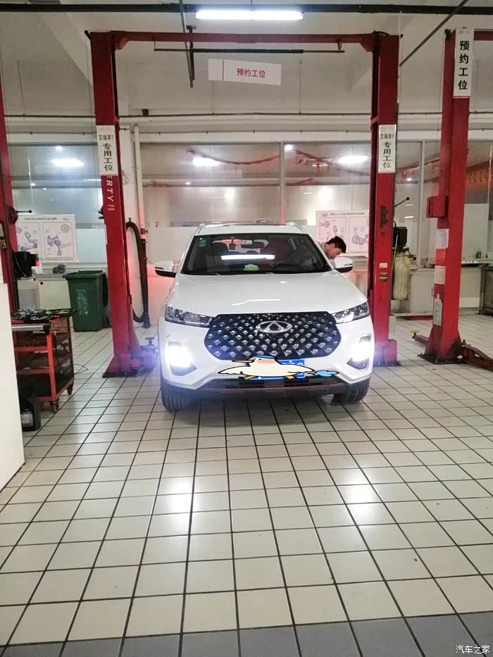 看这就是我的虎七,服务站小哥正把车子放在举升机上,先固定位置。