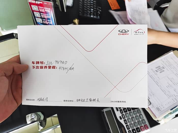 信封上写着下次的保养公里数,如果加上日期就更好了。