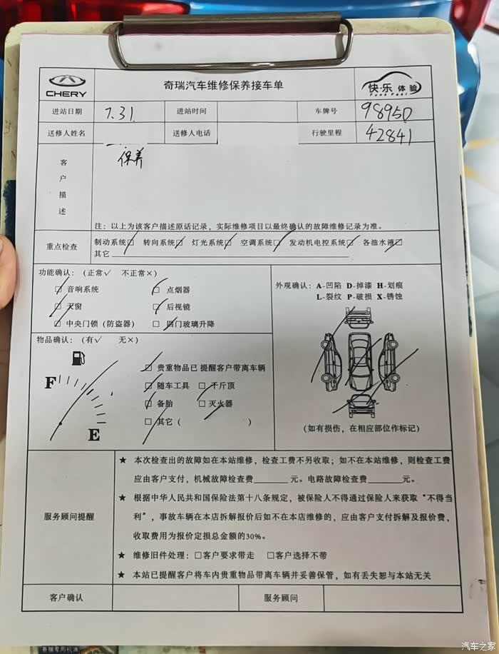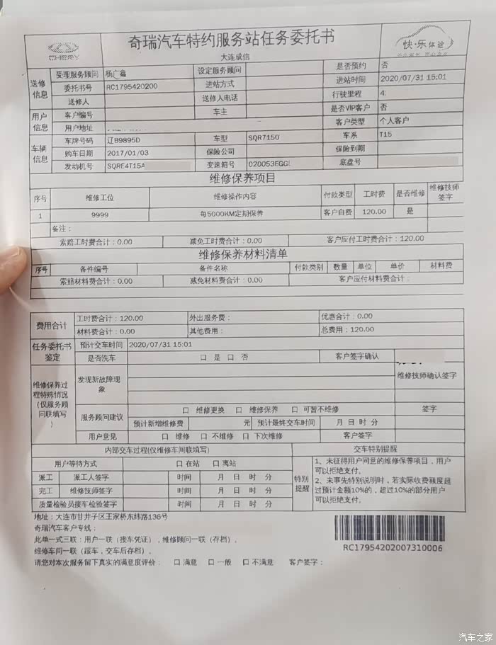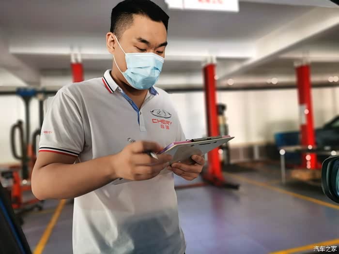 现在奇瑞4S都是机电一体,机修工+电工,这次给我保养的是老相识小君,做事比较认真,我这个人有点完美主义者,强迫症,而且还爱问,而他很有耐心,有问必答,所以每次都找他,本来今天他休息,结果因为疫情,另外一个机修被隔离在高风险地区内,出不来,所以他只能过来了,我来之前还问我是不是高风险地区的,如果是,过一段时间再来,他给我申请延期保养,服务很贴心。