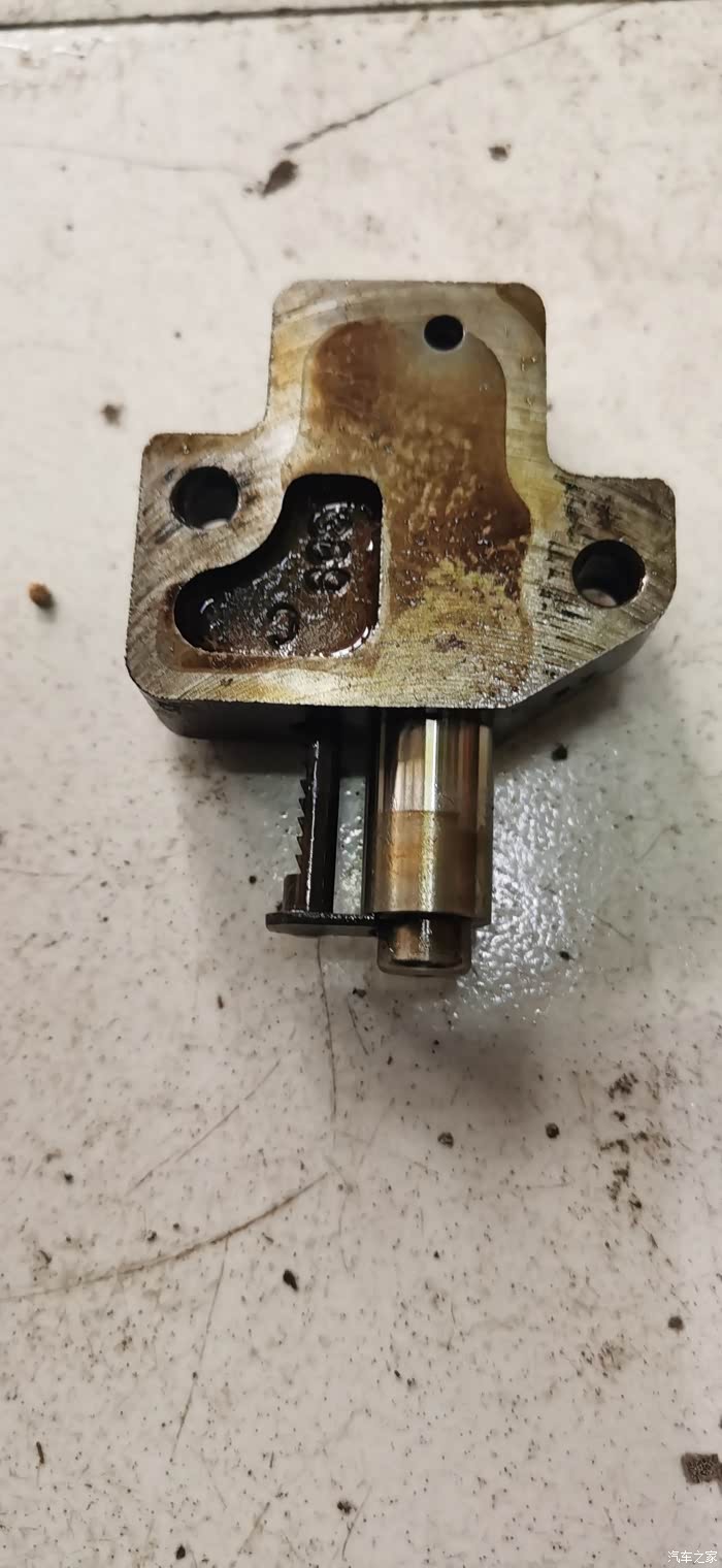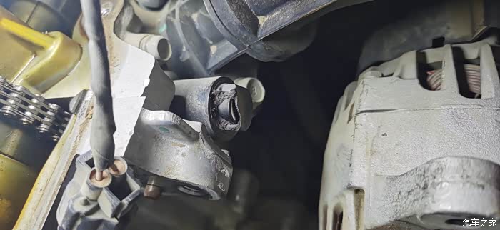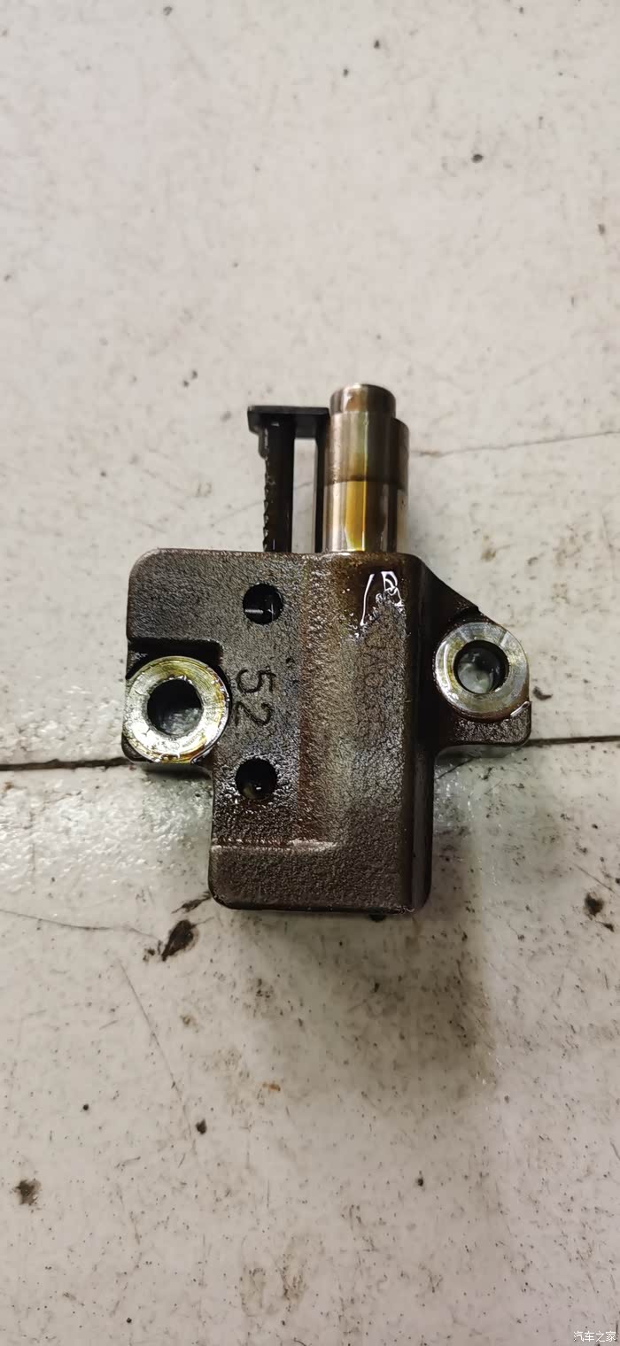 这个就是涨紧器,主要作用就是顶紧正时链轨以保证正时链条保持合理的松紧度。现在已经是完全弹出来了,弹性减弱导致链条松动异响。
