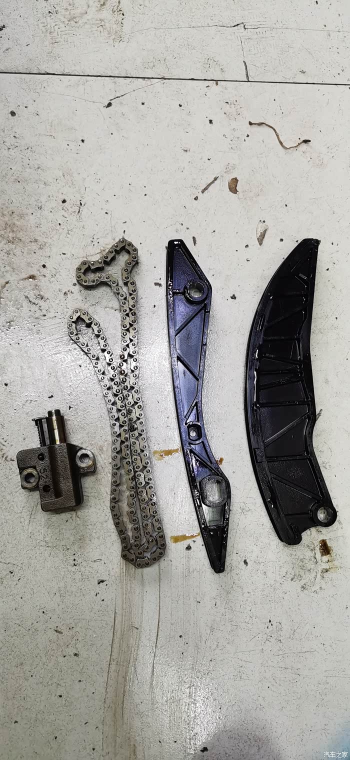 拆下来的涨紧器、正时链条、导轨盒