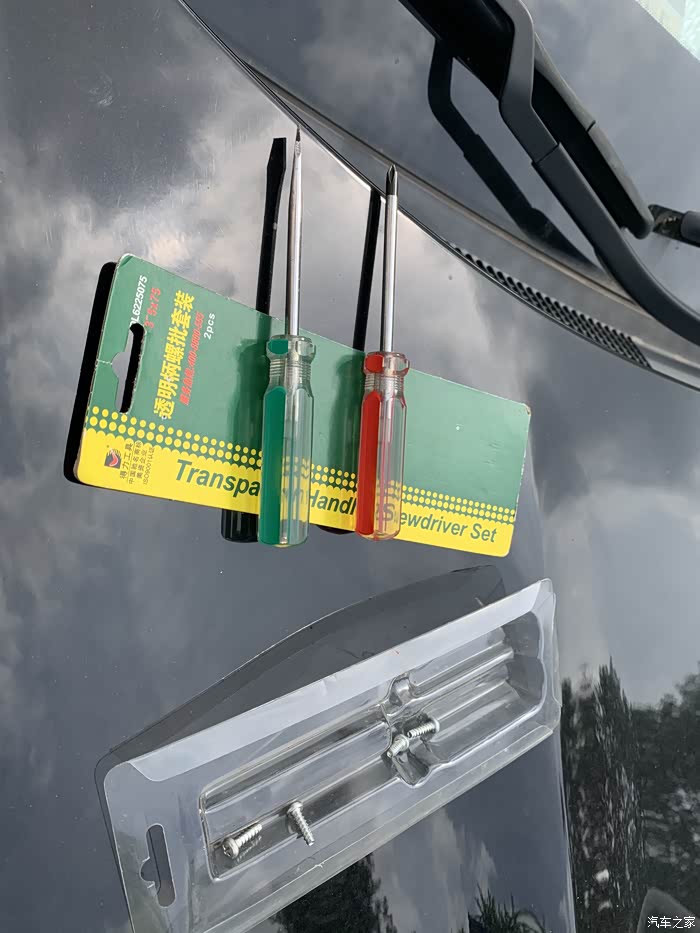 2、拿出工具螺丝刀,给大家看下我的螺丝刀。其中十字的是拆螺丝用的,二平口的是用来撬后视镜的。