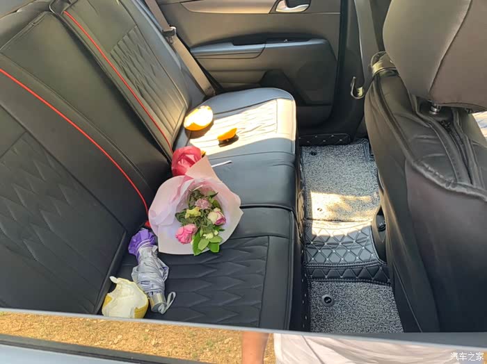提车送的花放新车上吸点新车味道,后排效果脚垫半包,挺好了。