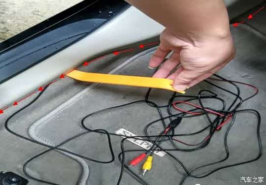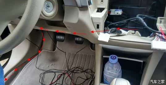 布倒车视频延长线。注意:布线的时候,一定要把线理顺,从方向盘底下过的时候不能和方向盘转轴接触,同时也不能影响刹车,离合,油门的正常使用
