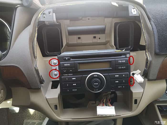 这下收音机也下来了,把收音机天线和电源线拔下来。注意:线上是有扣子的,一定要把扣子用手压下去然后再拔下来