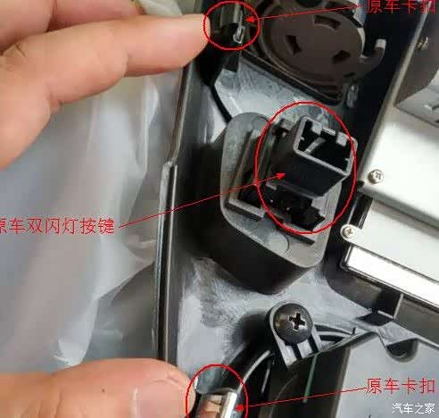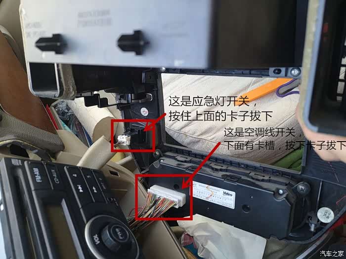 把原车面板上的应急双闪灯线和空调线拔下来。注意:线上是有扣子的,一定要把扣子用手压下去然后再拔下来