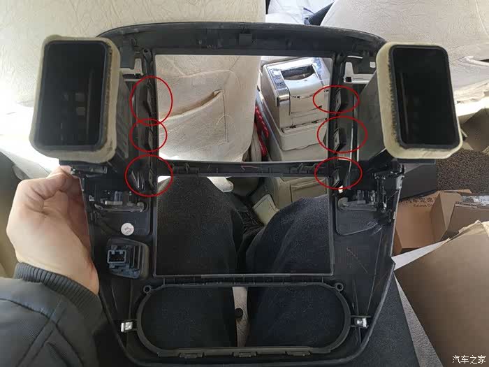 空调通风口一样要拆下,图中画的对面也有对应的卡子,一样要撬完用纸垫一下好拆下一个。