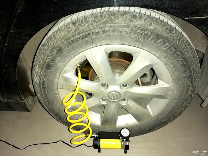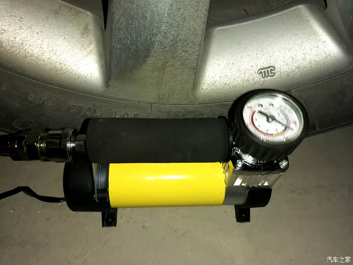 拿出充气泵,打火,把连接线插在点烟器上,拧下轮胎的气门嘴帽,连接完毕,打开充气泵开关,蹦蹦蹦地开始工作了。。。。。。