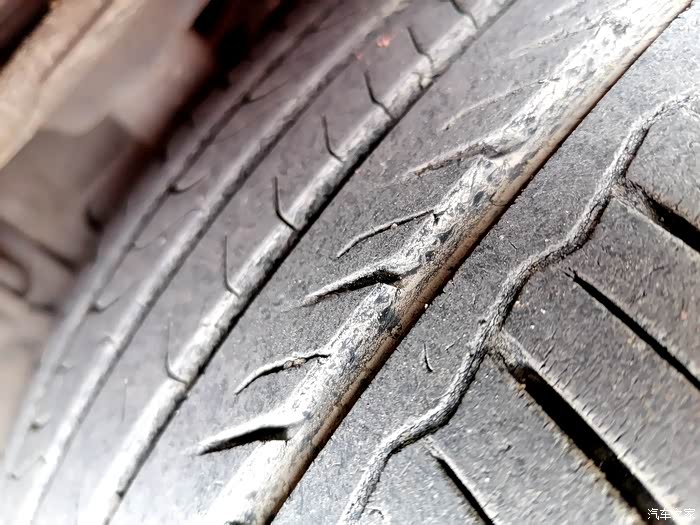 这是用了三年的安乘轮胎,表面磨损平整,胎面也被小石子蹂躏的伤痕累累啦,不过她采用对称花纹设计,其中两侧胎肩采用了变节距设计,这种设计可以减少行驶中产生的噪音。胎冠中间三条肋条有许多细小的沟槽,当轮胎接触地面时能互相咬合,配合抬肩上封闭式的大块花纹,能为轮胎提供更大的触地面积,增强轮胎的抓地力,理论上能缩短刹车距离。可见设计者的用心良苦。