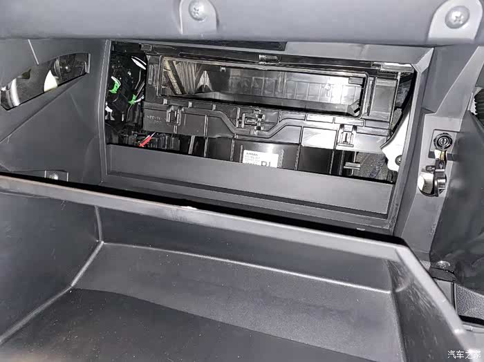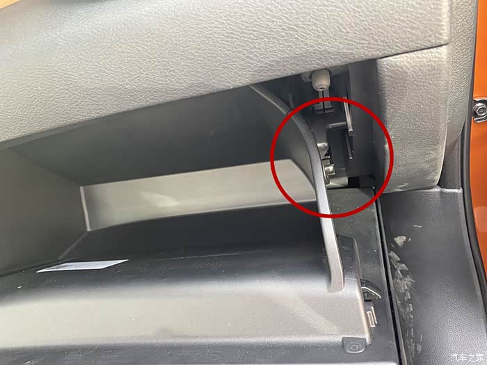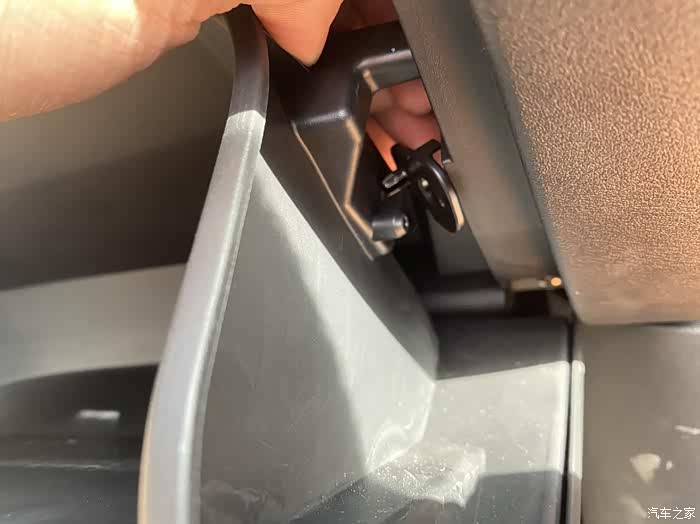 这空调滤芯就在车辆的右侧杂物箱内部,挺容易找到的。杂物箱是通过右侧的拉锁来实现杂物盒自动关闭的。