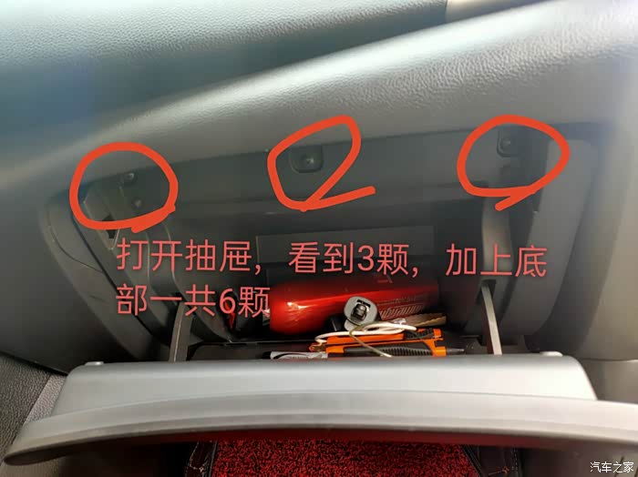 先拆下副驾驶的抽屉,一共6螺丝,很简单,拧开直接把抽屉拿下来
