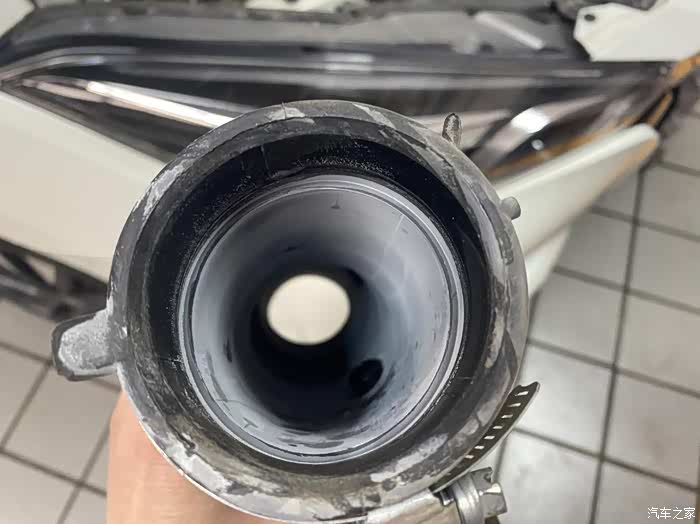 空气滤芯与节气门连接的部位是靠软管连接,可以看到外部已经是非常脏的了。