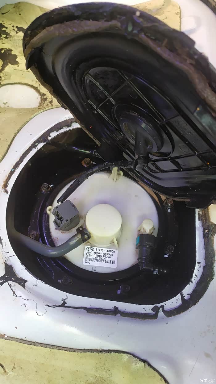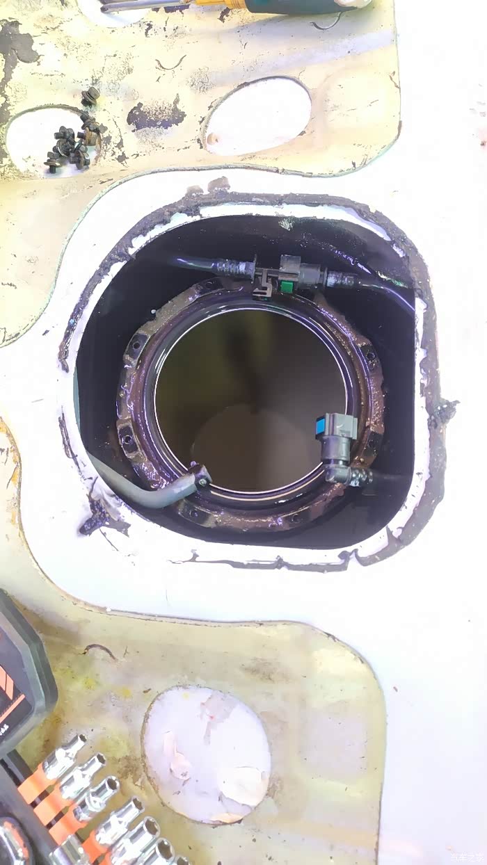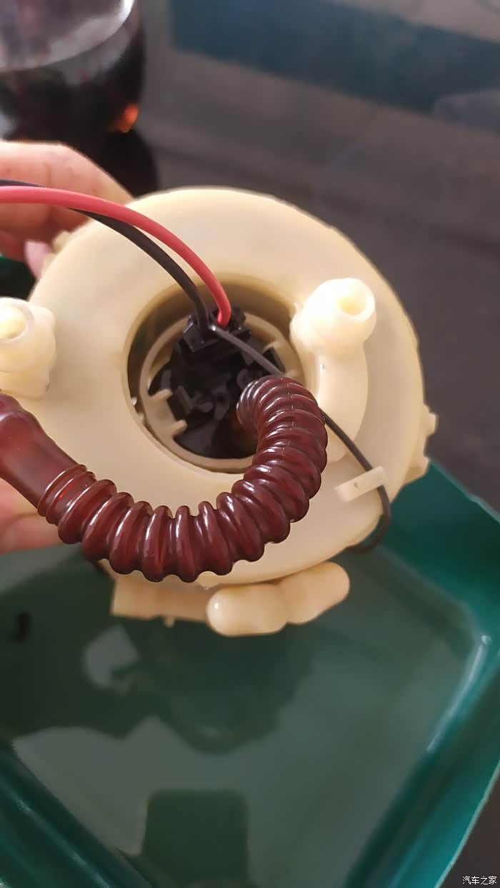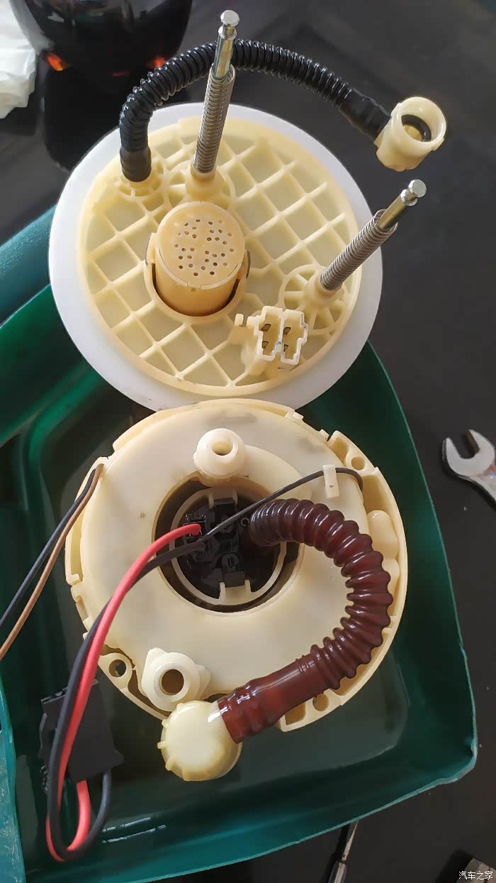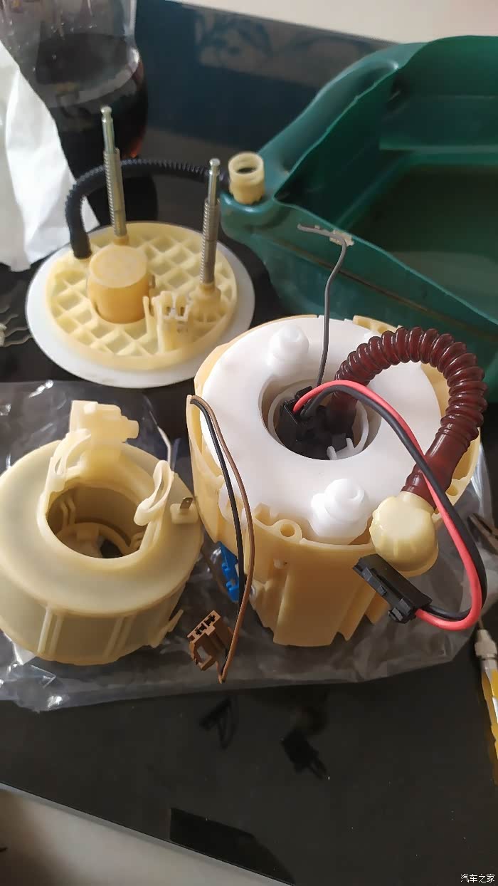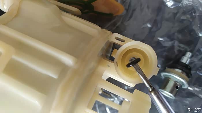 把固定总成的一圈螺丝拧掉,拿下铁圈,就可以把油泵提出来,过程要慢,不要碰撞油量浮子,把滤芯里的汽油慢慢倒入油箱,里面有不少汽油,避免浪费,尽量油量少的时候更换。油箱口有一个橡胶密封圈,注意别掉进油箱。