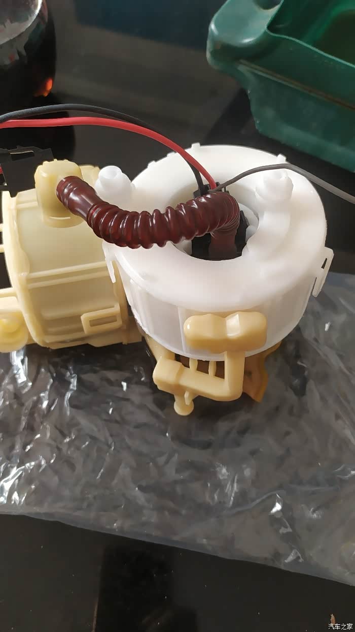 然后把油泵从下往上推入滤芯,卡到滤芯上。注意油泵上有一根黑线,此时需要插回滤芯上。