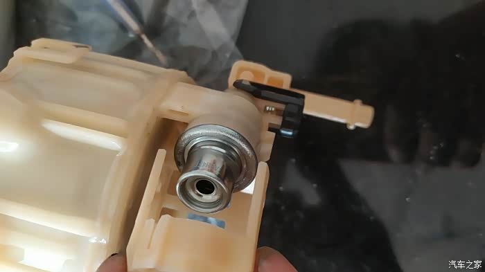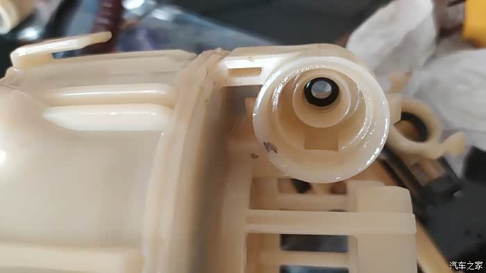 取下滤芯上这个不知名的东西,通过卡扣连接的,注意两端接口都有密封圈,注意不要用蛮力把卡扣掰断。