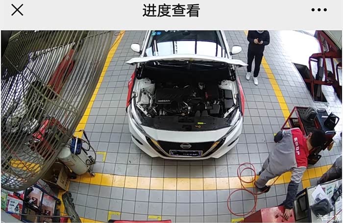 等了大概半个小时,看到我的车已经进入工位,开始维修了。我赶紧去车间看看。不是对保养师傅不放心,而是想自己多观摩观摩,多了解下车子相关的知识,日后总是用的着。这个就是在手机上看到的维修直播画面。