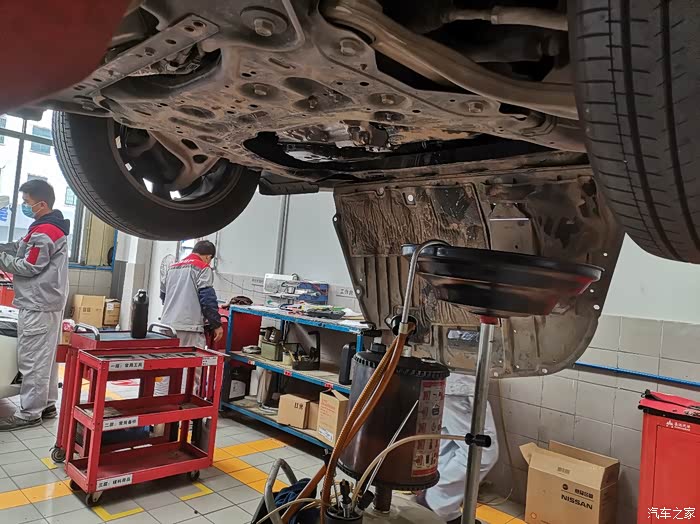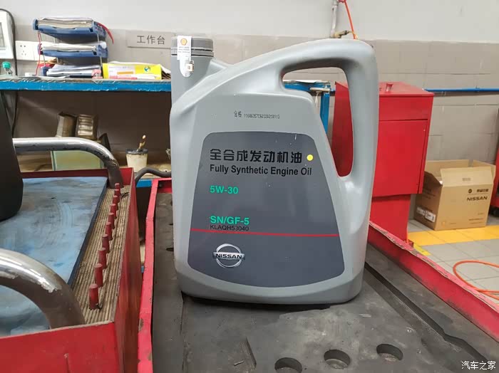 这是旁边的新机油,日产专用的。上次保养换的0W-20超级全合成,这次搞了个5W-40全合成,经济下行,机油也降档了。