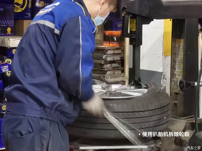 区别于上次紧急在路边就近找人维修不同,这次来的是比较规范的维修店,机修师傅首先使用扒胎机拆除了轮毂。