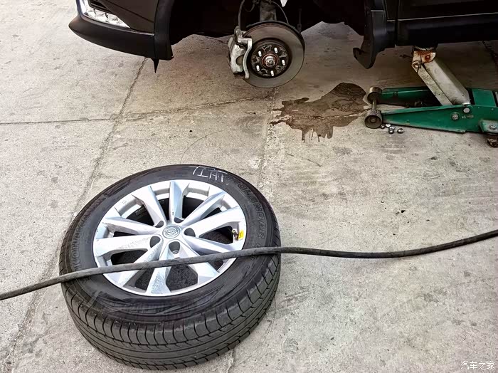 当天下着小雨,下班回家时启车刚开出一小段,逍客的胎压监测就开始报警了,显示左后胎气压只有1.7bar(正常为2.4bar左右),随机停车查看,果然车胎上隐约看到有一个大“刺”——十字花钉子。其实并不是当天炸的钉子,因为当时的故障现象是左前胎慢漏气,胎压显示的数值总在慢慢降低,因此在当天送到了汽修店检查了一下。拆下轮胎,补胎师傅用泡沫水检查了一下,果不出所料,又扎脚了