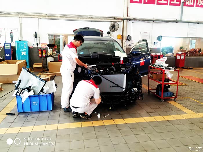 在维修车间看到一辆蓝色的事故车,正在装新的水箱。估计这台车事故不小。车友们开车在外还是要小心点。