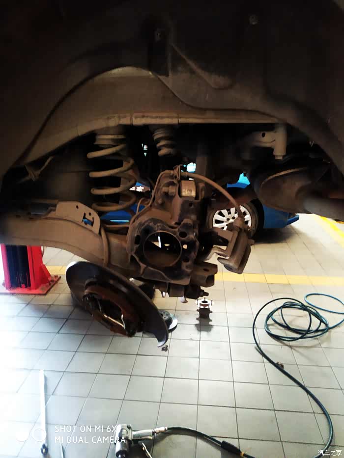 最近开车速度跑快一点就发现车内有嗡嗡嗡的声音,开始我以为声音是从发动机内传出来的,就没怎么在意,后面跑高速发现声音特别大,才意识到可能是车有问题了,仔细听了听声音传进来的地方是从后面两个轮胎发出来的,今天有空回4S店做了个检查,顺便把左后那条漏油的避震换了。4S的师傅把车开去高速路上测试了一圆回来,确认了异响位置,现在拆下了后面的两个轴承拍照申请售后更换,要等厂家回复确认,这个过程需要好几天才能知道结果了