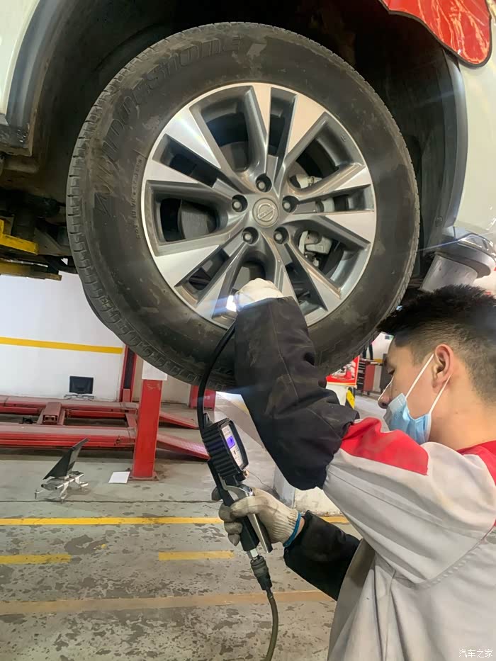 这是测测胎压,气多了小师傅给放放,气少了,小师傅给冲上一点,这个不错…