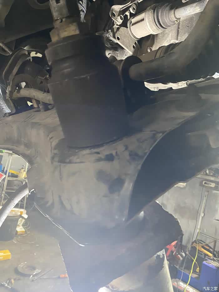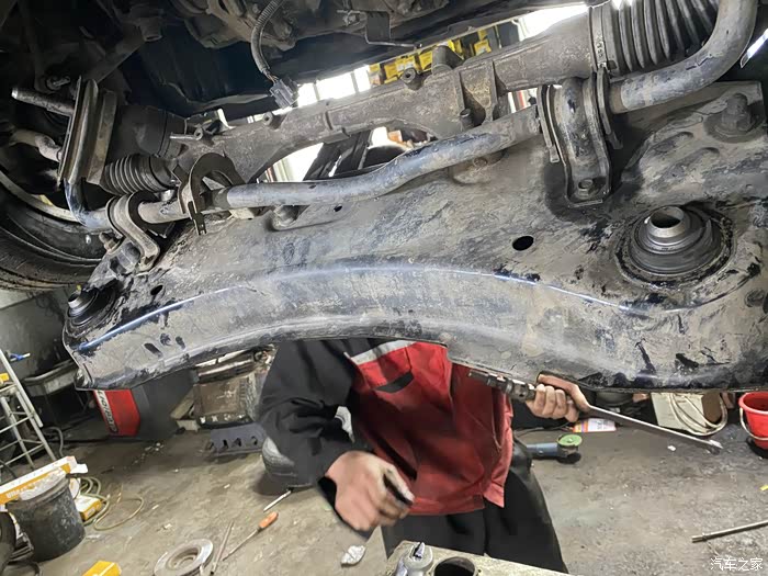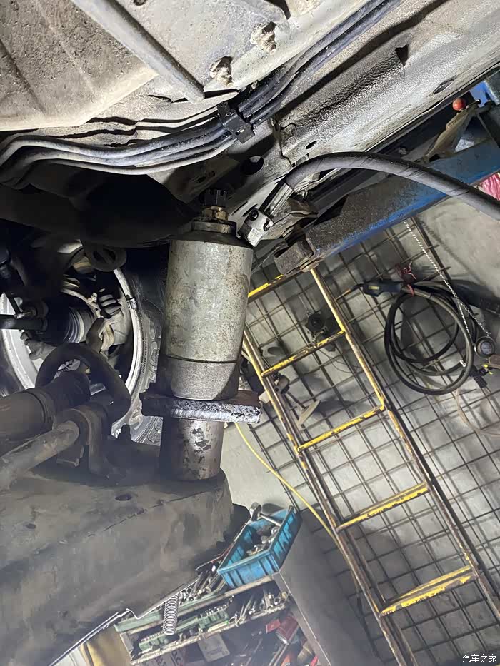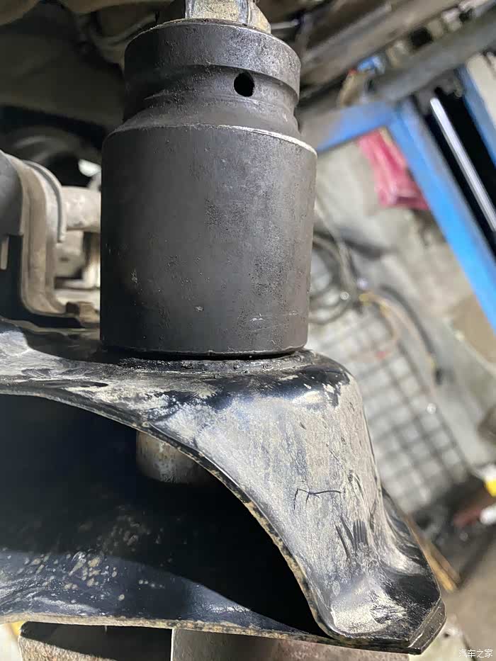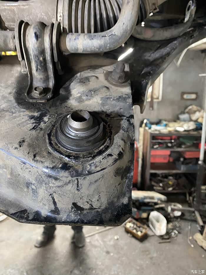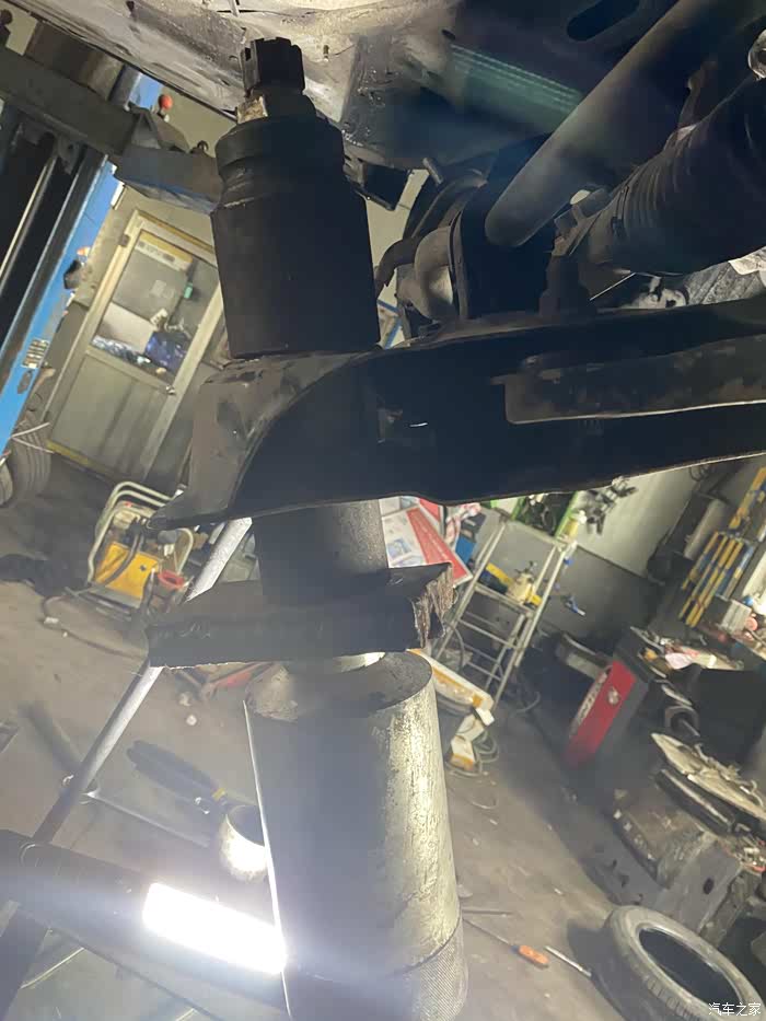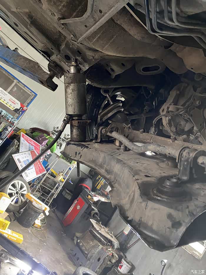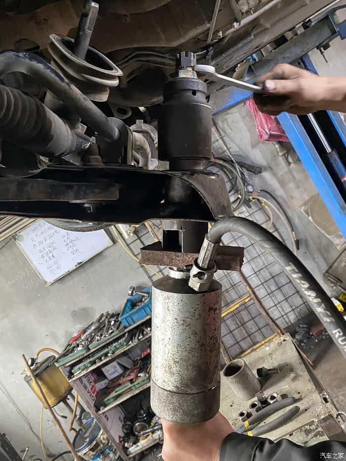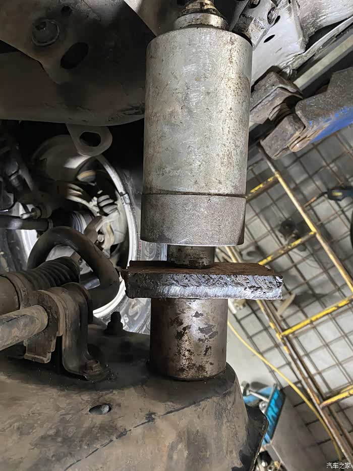 左右两个都压好,从这里能看到元宝梁没拆下来,转向拉杆跟下支臂都没拆,元宝梁吊着的