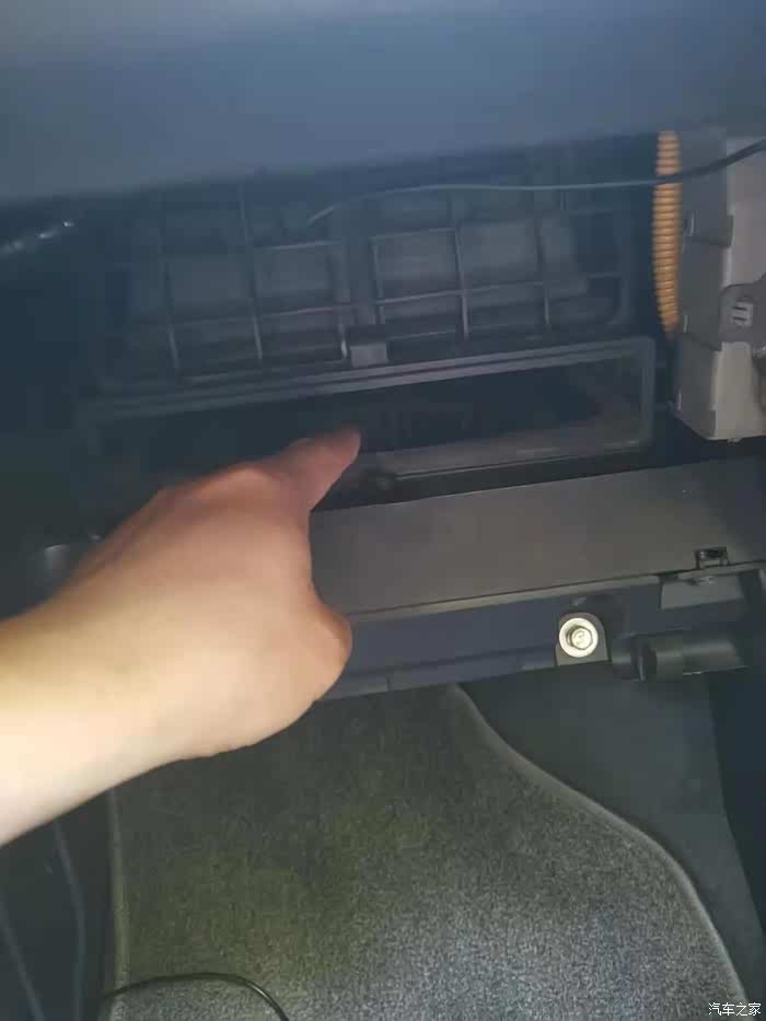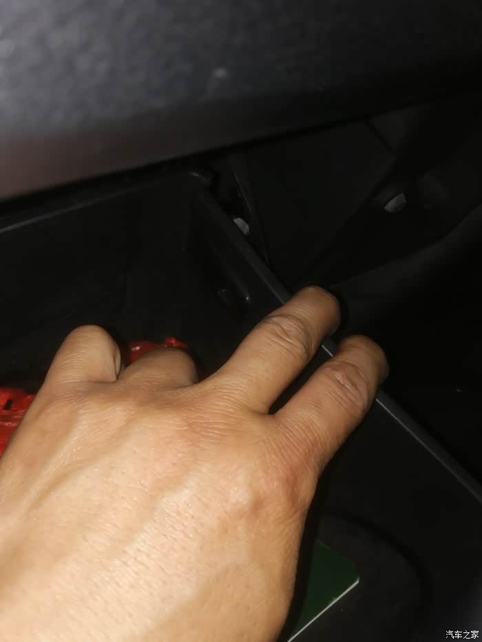 手套箱半开,把拉线摘掉,然后两边的卡子位置用手往内侧搬,就把手套箱放下来了
