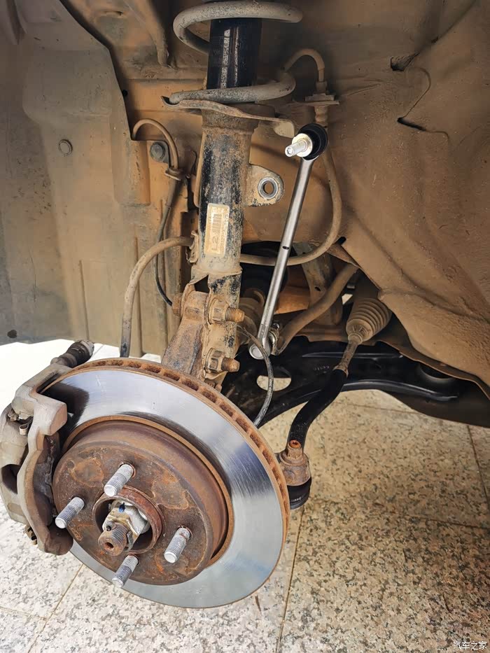 拆的时候不好取下平衡杆球头,我是用扳手转球头取下来的,取下来后平衡杆弹性复位,产生高低差,所以新装的也装不回去,不好用力压回去。撬棍撬平衡杆应该可以,我怕弄摆臂数据跑偏就麻烦,没撬它。