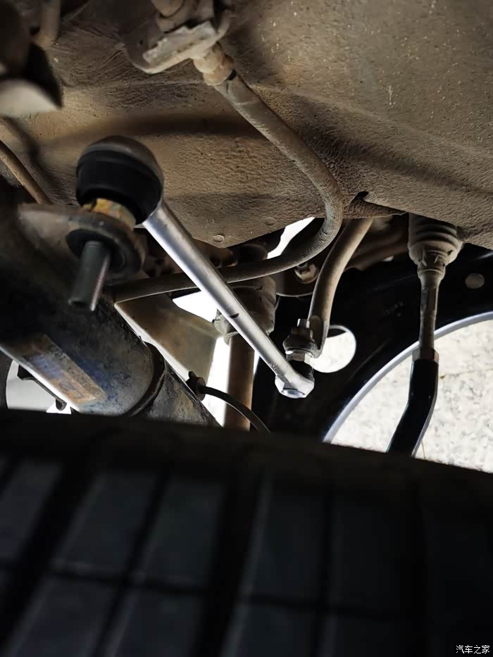 想了个办法,就是临时装回轮胎,千斤顶降低车身,让轮胎受力,摆臂水平位置,也就是车平时正常状态,伸手进去就能轻松取下球头杆了,装新的进去,拧上螺母,再顶起车身,拆下轮子,固定球头杆螺母,很省力。