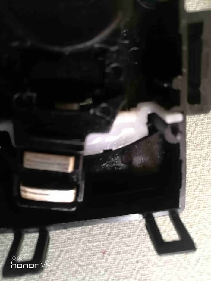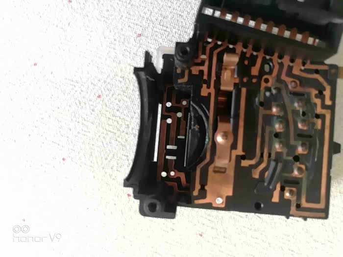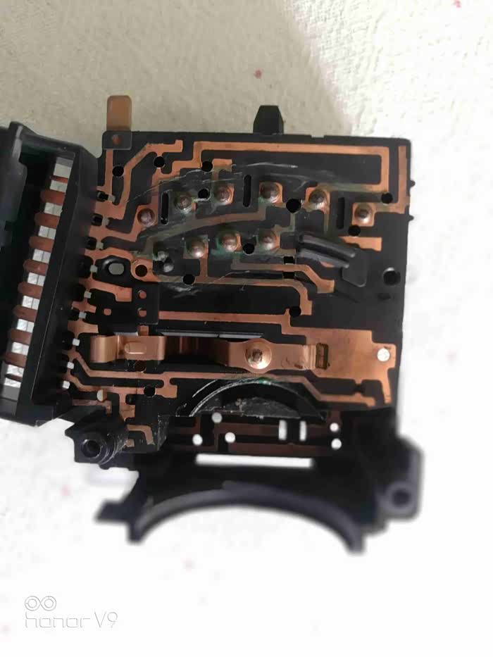 看吧,组合开关内部。本以为某根线路焊点脱落,实际分离后根本没有任何电线,完全是靠2个凸起的金属条和底板上的黄铜突起点接触连接。