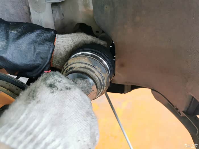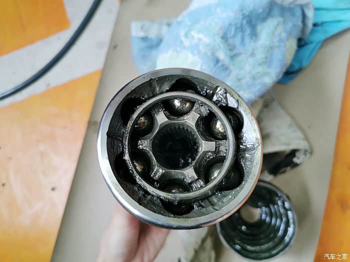 下一步是分离半轴与外球笼,再往里还有个内球笼,如果此时拆不下外球笼就只能全拆出来再处理。