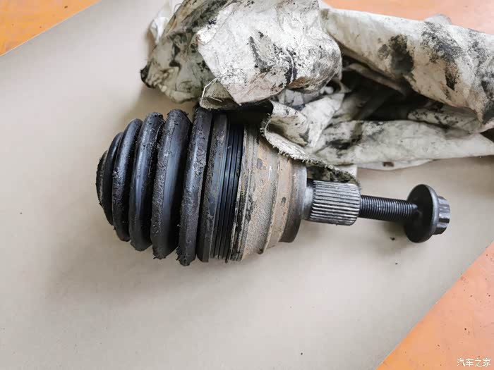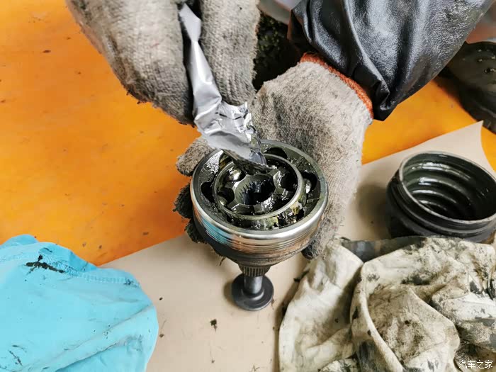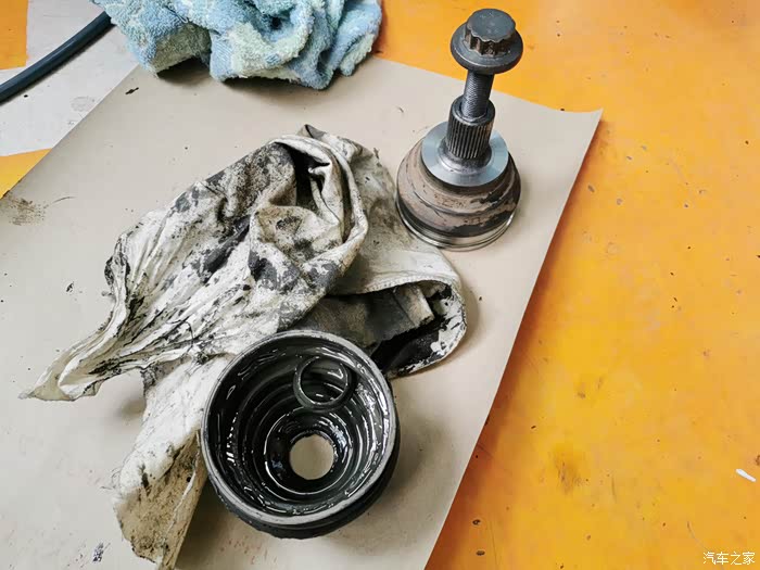 取下断裂的防尘套,再细细的擦拭一番传动轴。