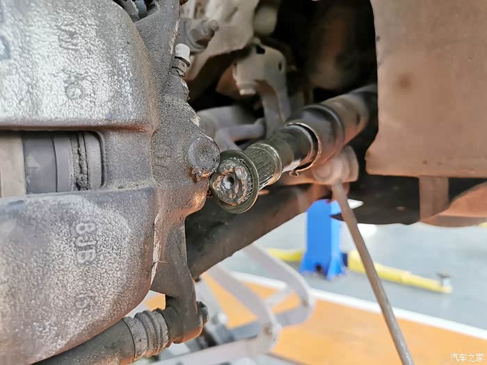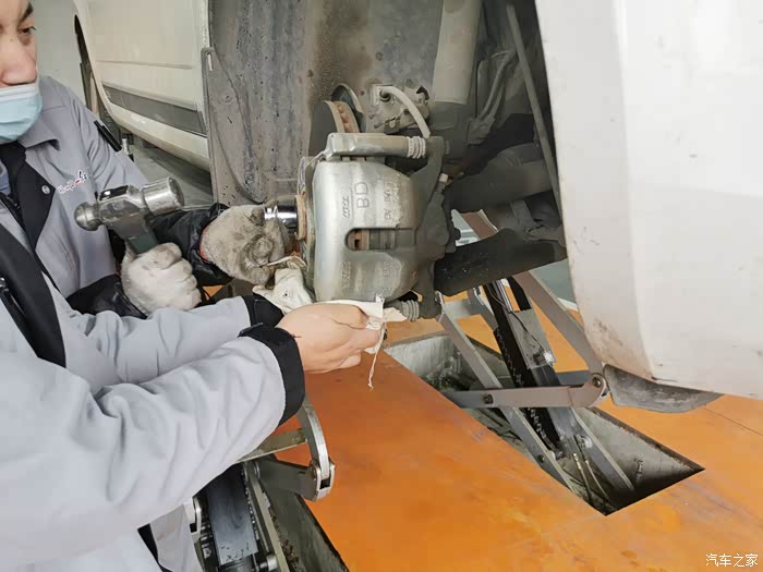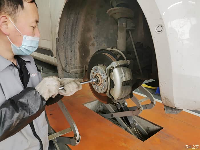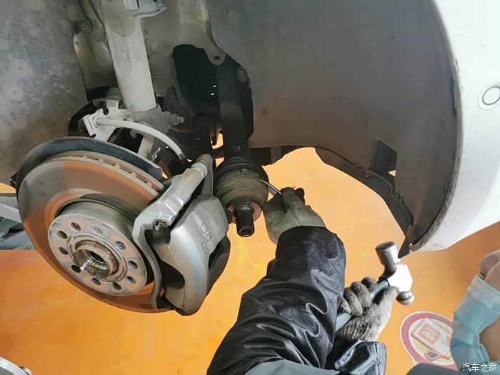 拆下轮胎后,师傅就进入正题了。第一步,拆半轴锁紧螺母。