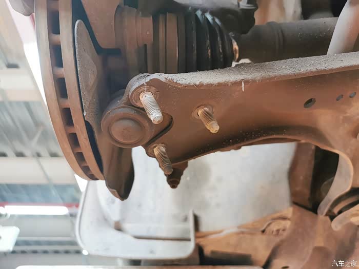 第三步是难点,从转向节上拆下控制臂球头。拆了十多分钟,师傅发现一个人有点难以搞定,于是又喊来一位,又经过五六分钟,终于拆下来了。