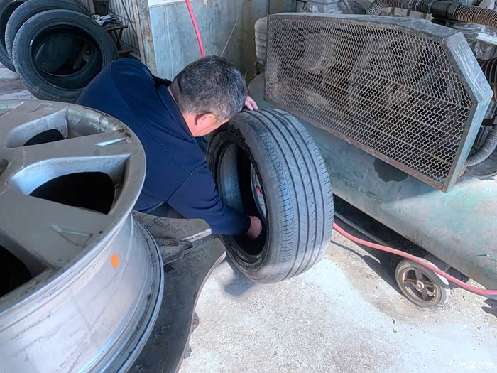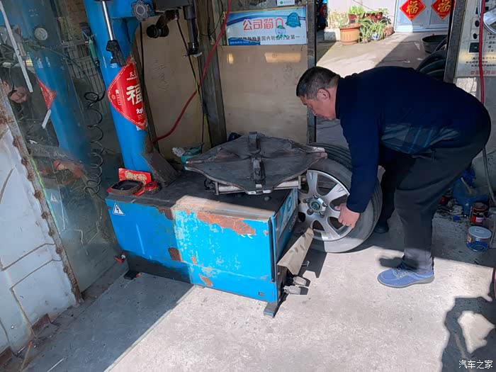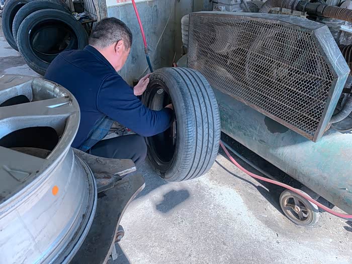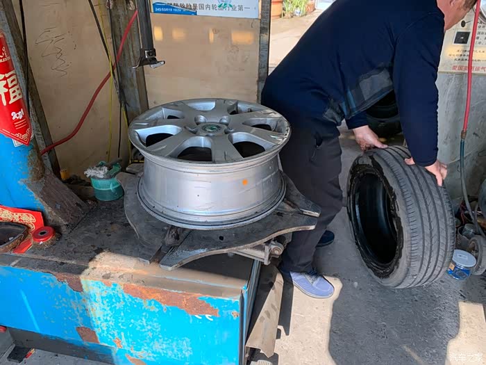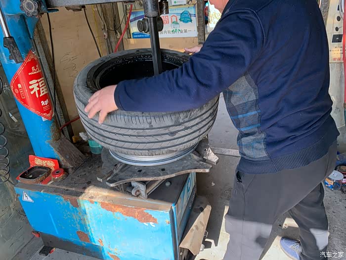 师傅先把轮胎从轮毂上拆下来推到维修店内。